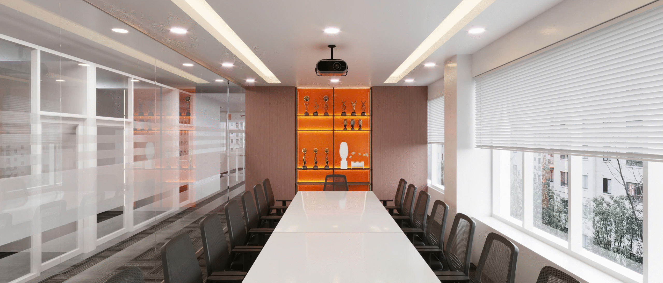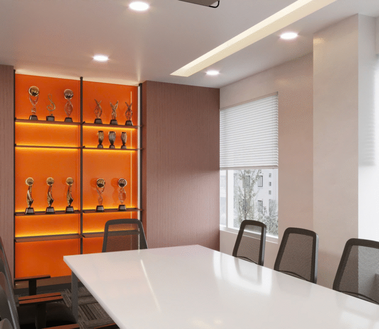 Phong cách chủ đạo là Modern Corporate Classic – kết hợp giữa gam màu trung tính, vật liệu tự nhiên và ánh sáng tinh tế. Tông trắng – be – xám mang lại sự thanh lịch, trong khi sắc cam ánh đồng ở quầy lễ tân và kệ trưng bày tạo điểm nhấn năng lượng, biểu trưng cho sự thành công, danh tiếng và sức mạnh thương hiệu.